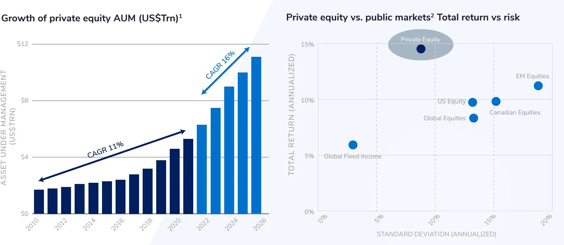 Source: (1) 2021 figure is annualized based on data to March. 2022-2026 are Preqin’s forecasted figures. 2 Sources: Private equity data provided by Cambridge Associates. Public market indices provided by Morningstar Direct. Private Equity: Cambridge U.S. Private Equity Index (Legacy), Canadian Equities: S&P/ TSX Composite TR, US Equities: S&P 500 TR, Emerging Markets: MSCI EM IMI NR, Global Fixed Income: ICE BofA Global Broad Market TR HCAD, Global Equities: MSCI World NR. Time period, 10/01/2001 – 09/30/2021. Private equity returns are shown net of fees, expenses and carried interest. Data denominated in CAD. Standard deviation is a measure of how much an asset’s return varies from its average return over a set period of time and is commonly used to assess volatility in investment fu